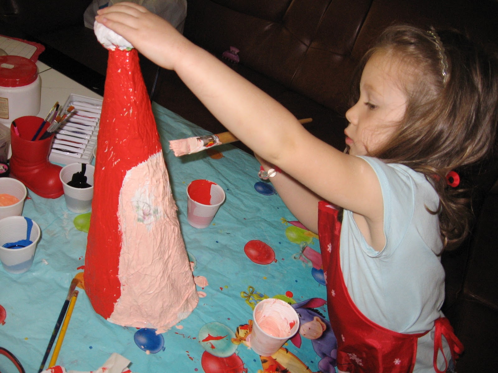Cand am ajuns acasa, i-am propus sa facem si noi un pitic la fel ca cei pe care-i vazuse la teatru. I-am facut intai forma din carton, am lipit toti trei hartie alba cu aracet, i-am dat o forma usoara cu un creion apoi am lasat-o pe Dia sa-l picteze cu vopsele pe baza de apa.