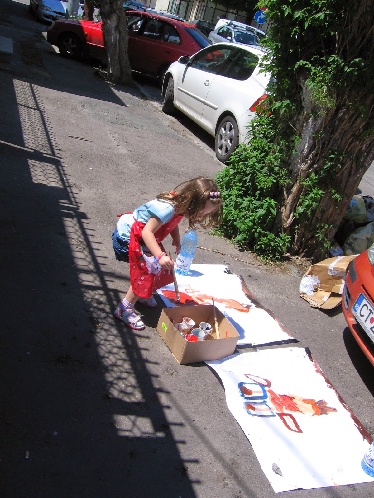 Pentru ca, dupa ce am terminat piticul, ne-a mai ramas vopsea, i-am dat pensula groasa si niste foi albe si am lasat-o sa se bucure de culori intr-o zi minunata.