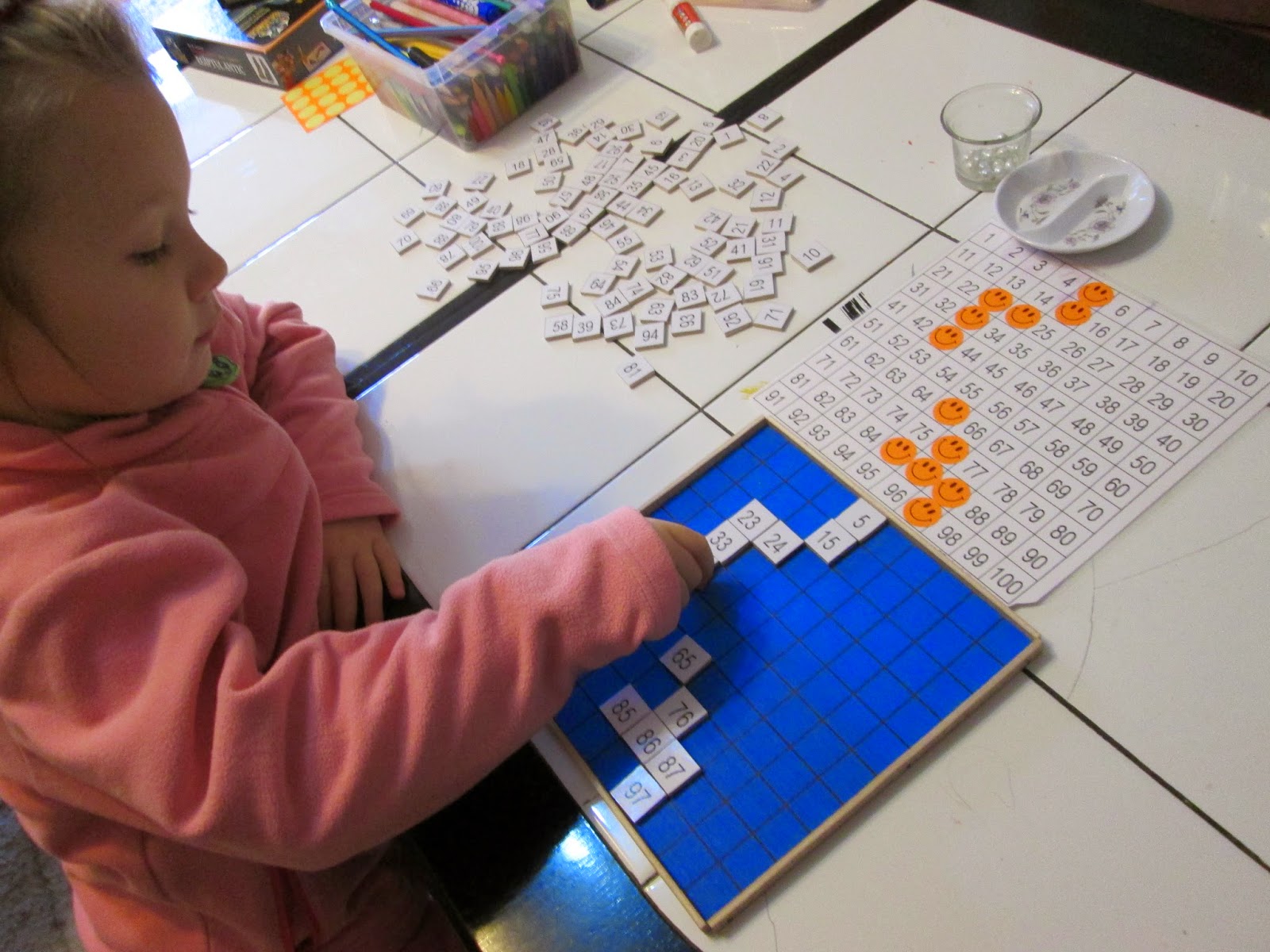 Dupa ce a inteles cum se foloseste tablita, am intors numerele pe masa cu fata in jos pentru a nu le mai putea alege inainte de a le gasi locul.