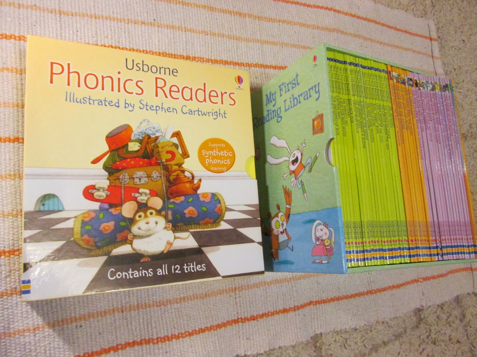 In primul rand, stiam ca nu functioneaza in cazul ei acea metoda prin care cuvintele sunt introduse progresiv, cu rabdare. Este curioasa si grabita, prefera povestile si nu ar avea rabdare sa invete cuvinte o perioada lunga de timp. Asa ca, atunci cand am aflat prima oara de colectiile editurii Usborne, am stiut ca si le va dori cu siguranta: imagini mari, povestiri frumoase, scris putin pe pagina si usor de intuit, cuvinte continand aceleasi grupuri de litere. M-am bucurat sa aflu ca pot procura cartile editurii Usborne chiar de la cineva din acelasi oras cu mine. Nu stiu cum sunt altii, dar mie imi e tare urat sa astept colete, sa comand lucruri pe care nu le pot atinge inainte, sa stau la cozi la posta... M-am bucurat tare mult cand am intalnit-o pe Adina la care am vazut multe carti interesante de la editura Usborne.