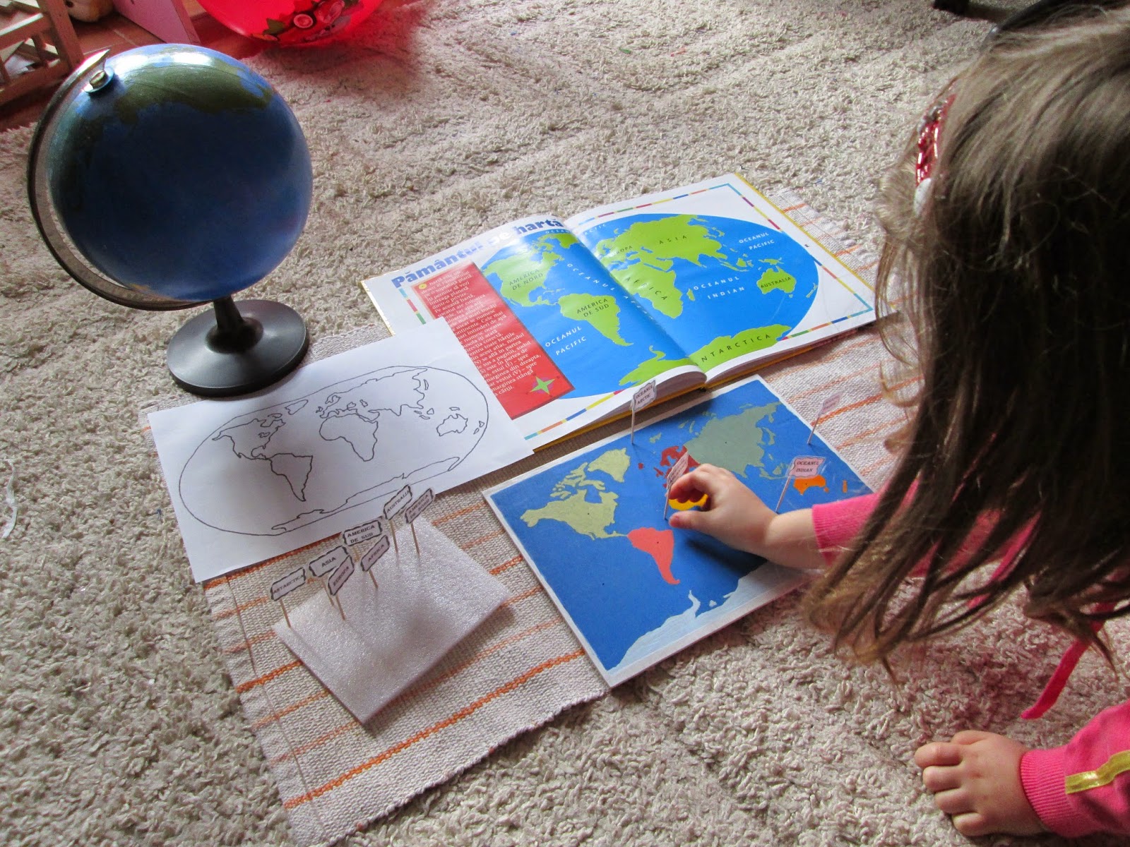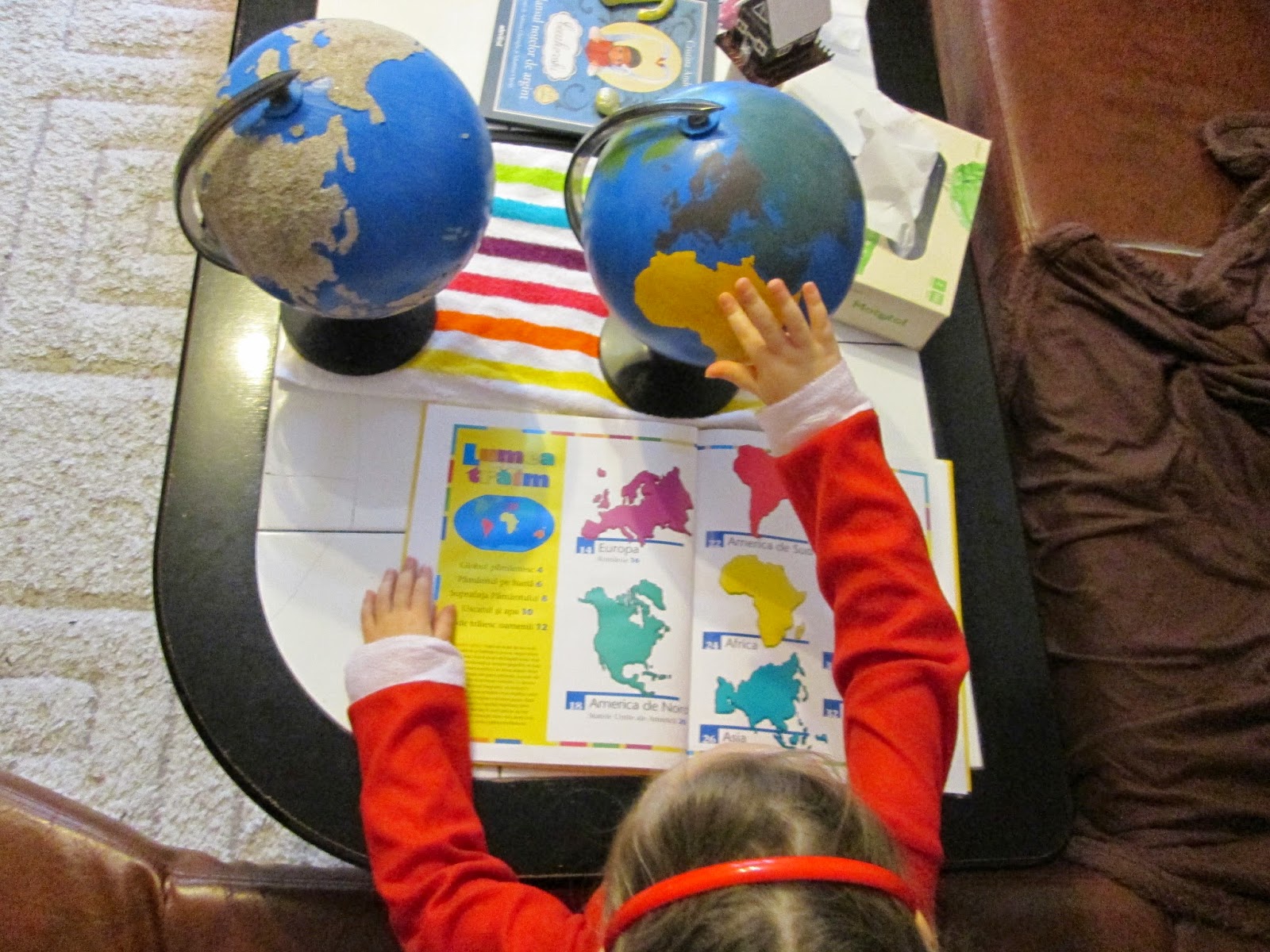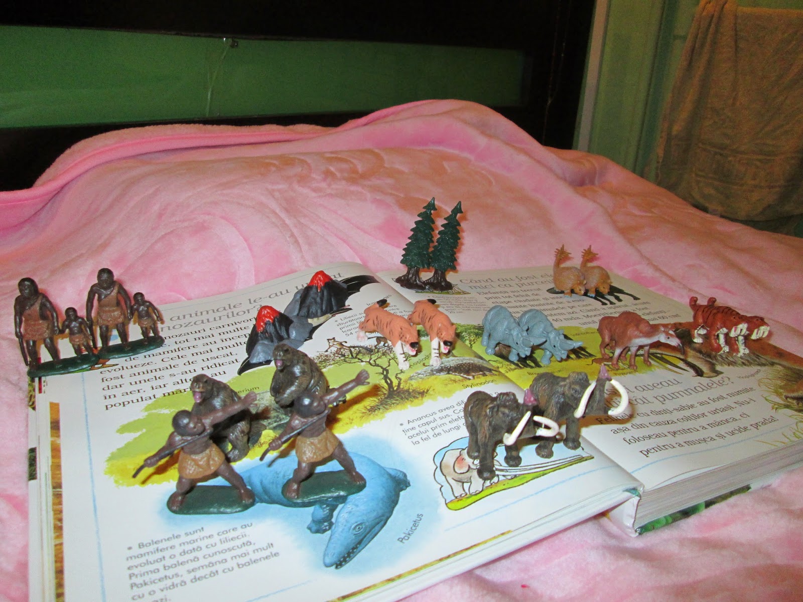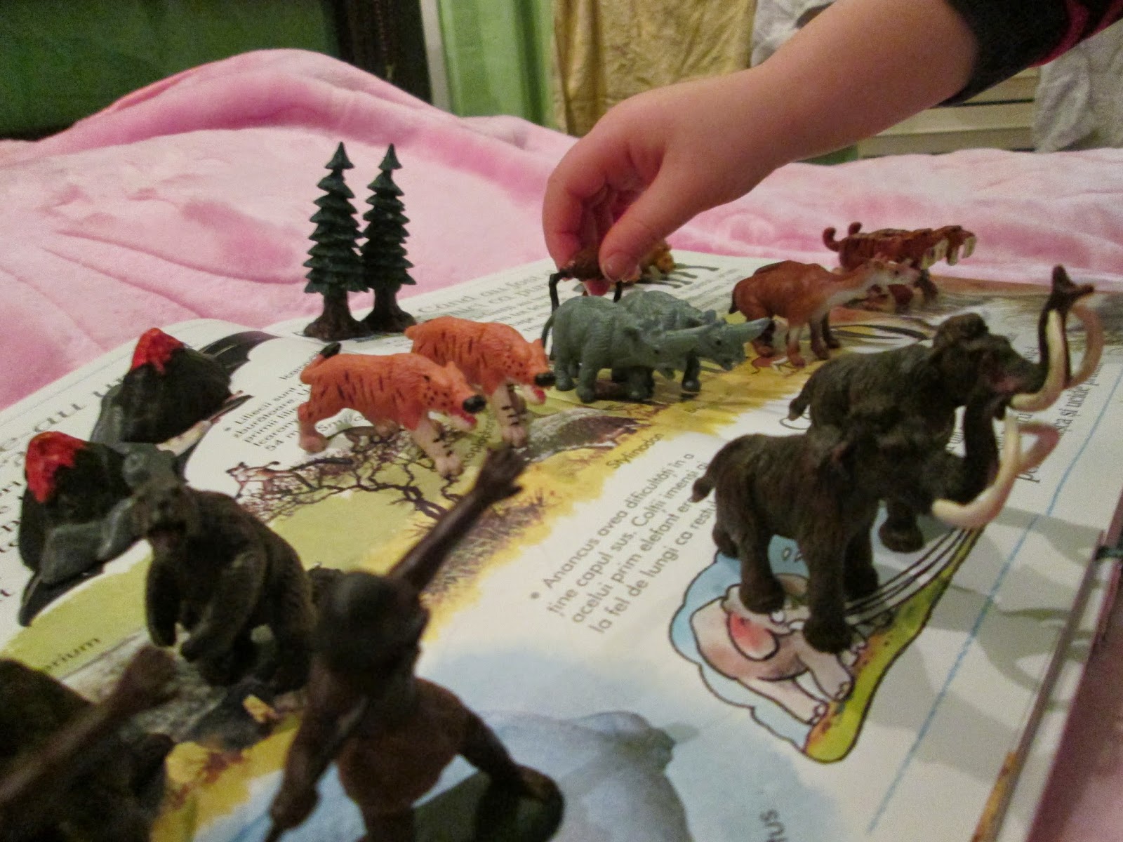Totul a pornit de la o discutie despre un mamut vazut intr-un desen. Ce era mamutul? De ce nu mai exista? Cum a evoluat? Pentru astfel de momente imi iau din timp diverse figurine, materiale si carti. Cand este interesata de ceva anume si pune insistent intrebari, nu am timp sa plec in oras sa caut ce o intereseaza si nici la calculator nu-mi doresc sa apelez de prima oara. Asa ca am scos toate marile atlase si am cautat imagini. Aveam cateva procurate inca din toamna pentru a raspunde primelor intrebari despre istorie. Setul de animale preistorice de la Safari i-a placut tare mult!