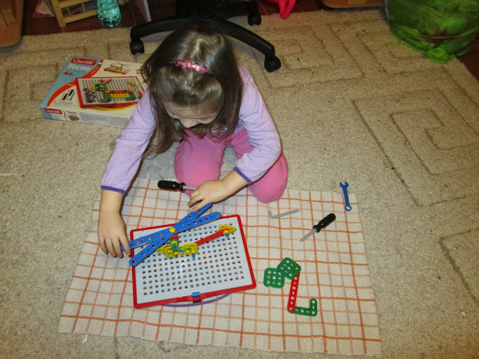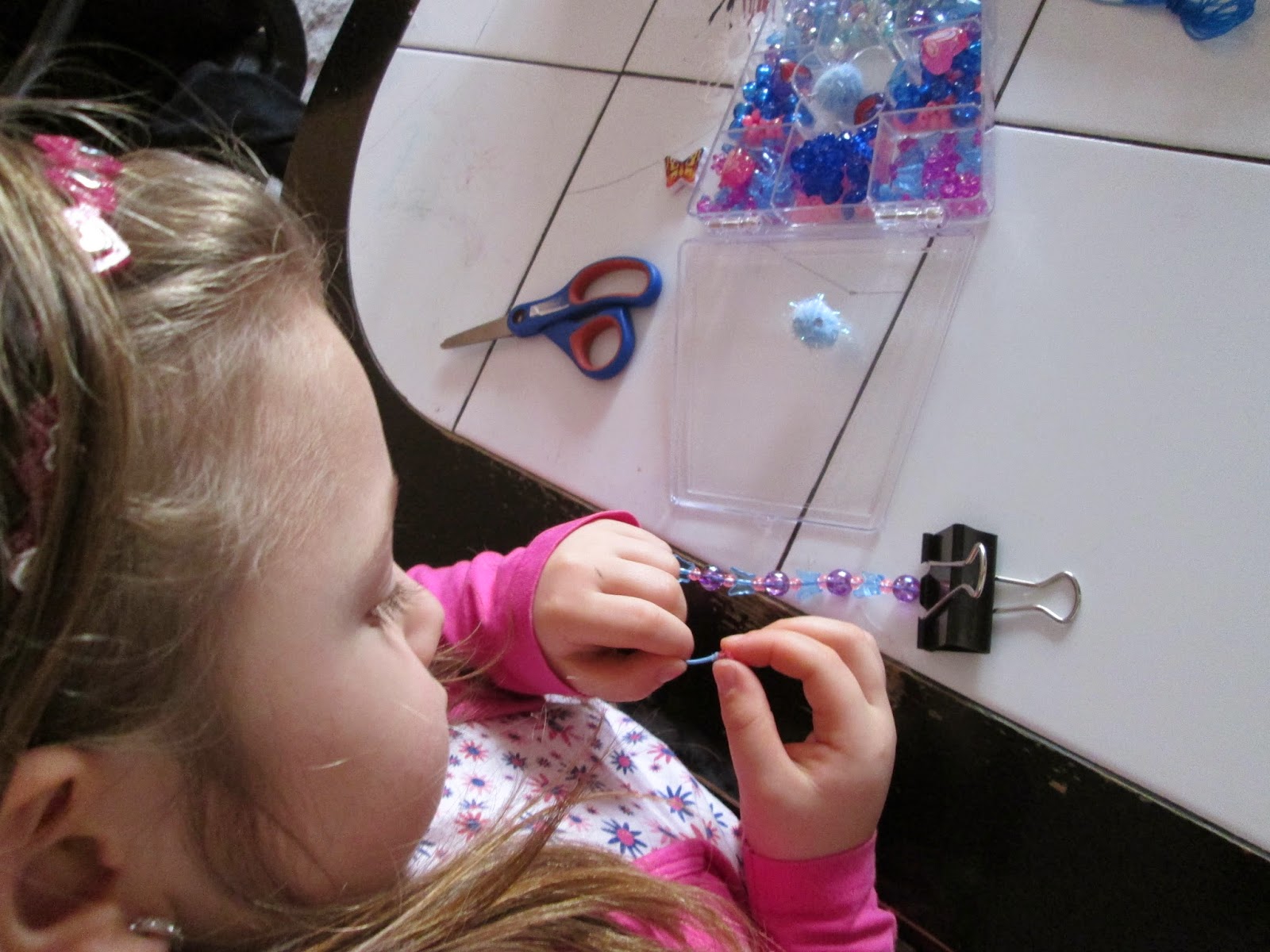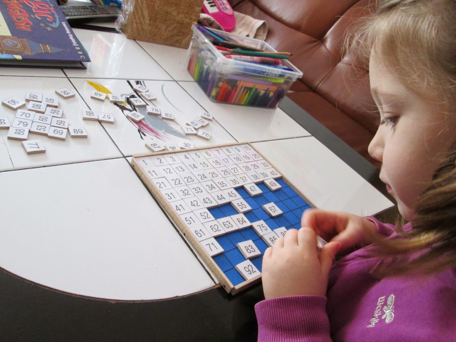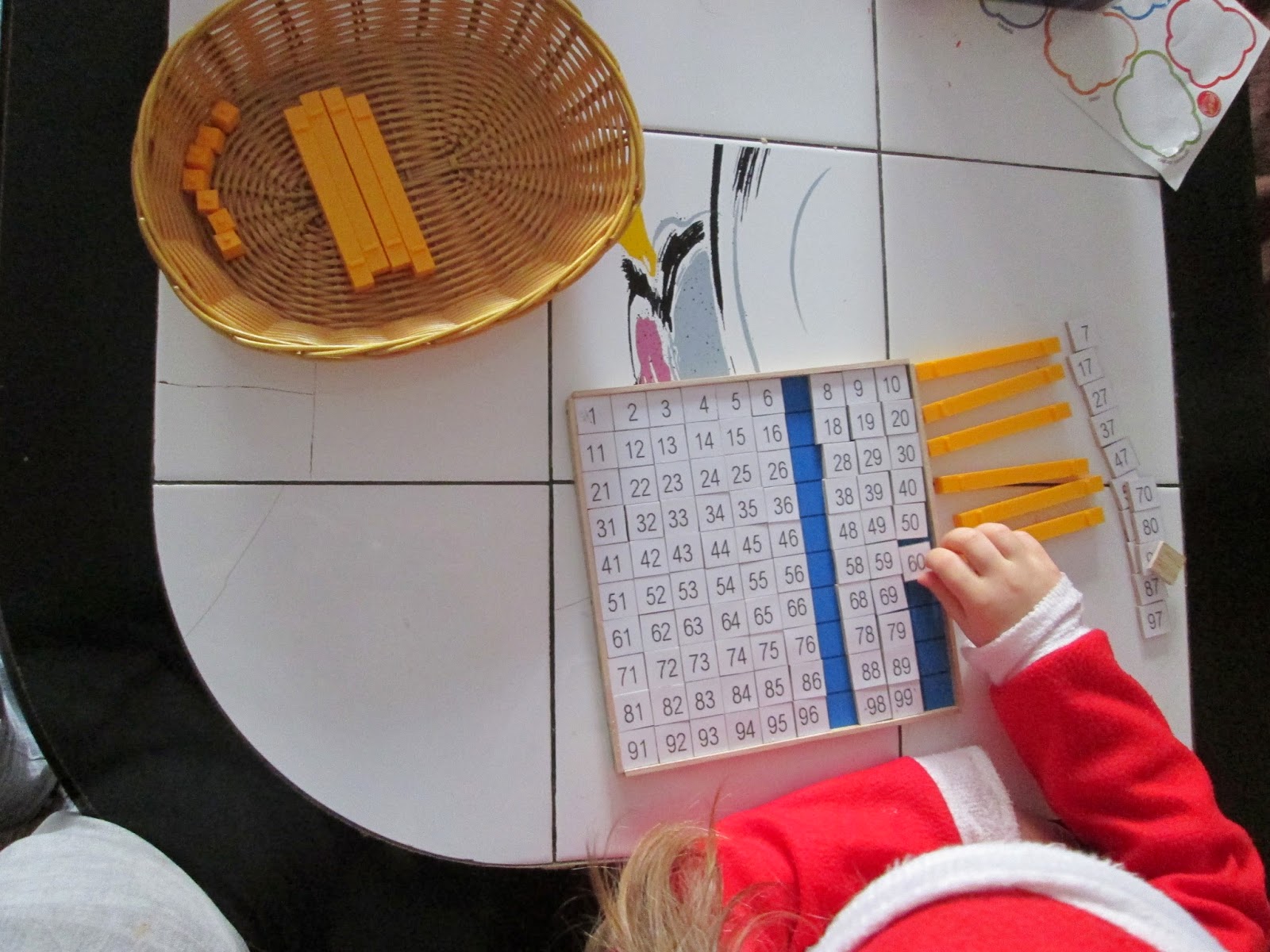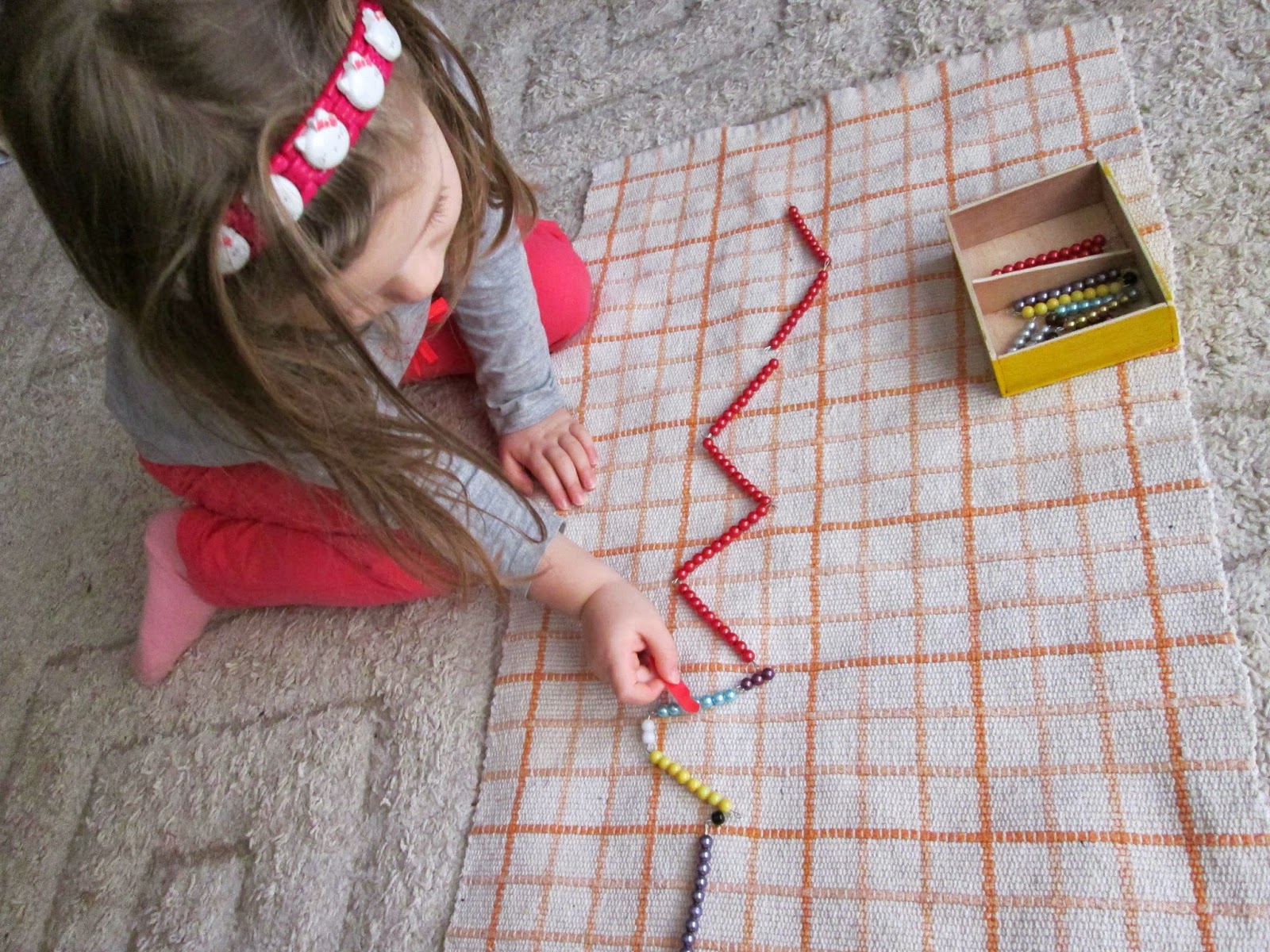 Cu riscul ca materialele noastre sa nu fie folosite 100% ca in sistemul Montessori, prefer sa ma adaptez din mers in functie de nevoile copilului meu. In primul rand, culorile folosite in confectionarea sirurilor de margele nu corespund culorilor din sistemul Montessori pentru ca nu am gasit margele avand acele culori. In al doilea rand, ma implic mai mult in activitatile ei decat o fac cadrele didactice din sistemul Montessori pentru ca Dia e singura. Nu are copii in jurul ei in timpul activitatilor de acasa si imi cere mereu prezenta. Ea este cea care spune ca vrea sa ne jucam impreuna, ca in cadrul unui joc vrea sa calculez si eu, si ea.